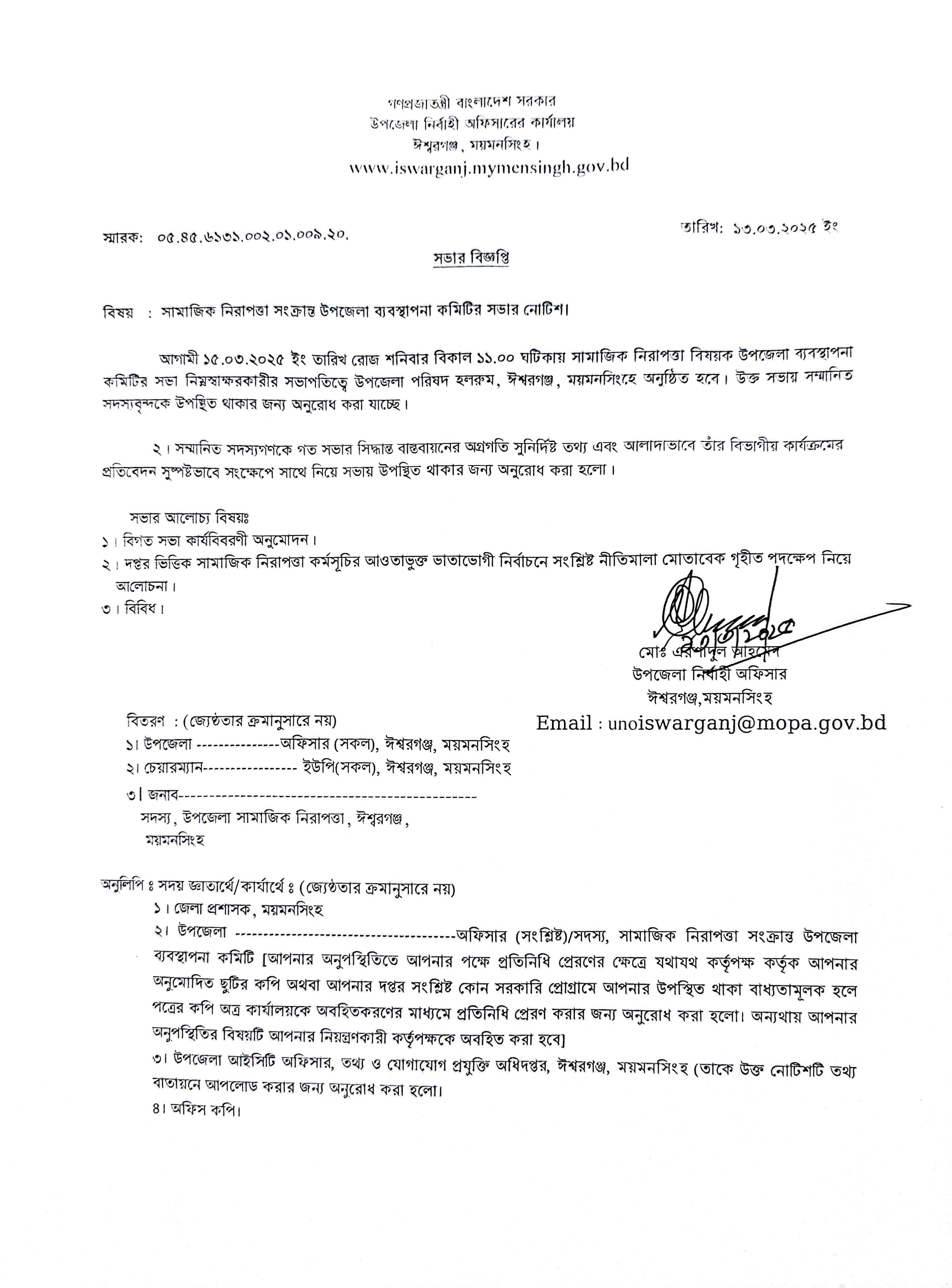 সামাজিক নিরাপত্তা সংক্রান্ত উপজেলা ব্যবস্থাপনা কমিটির সভার নোটিশ।